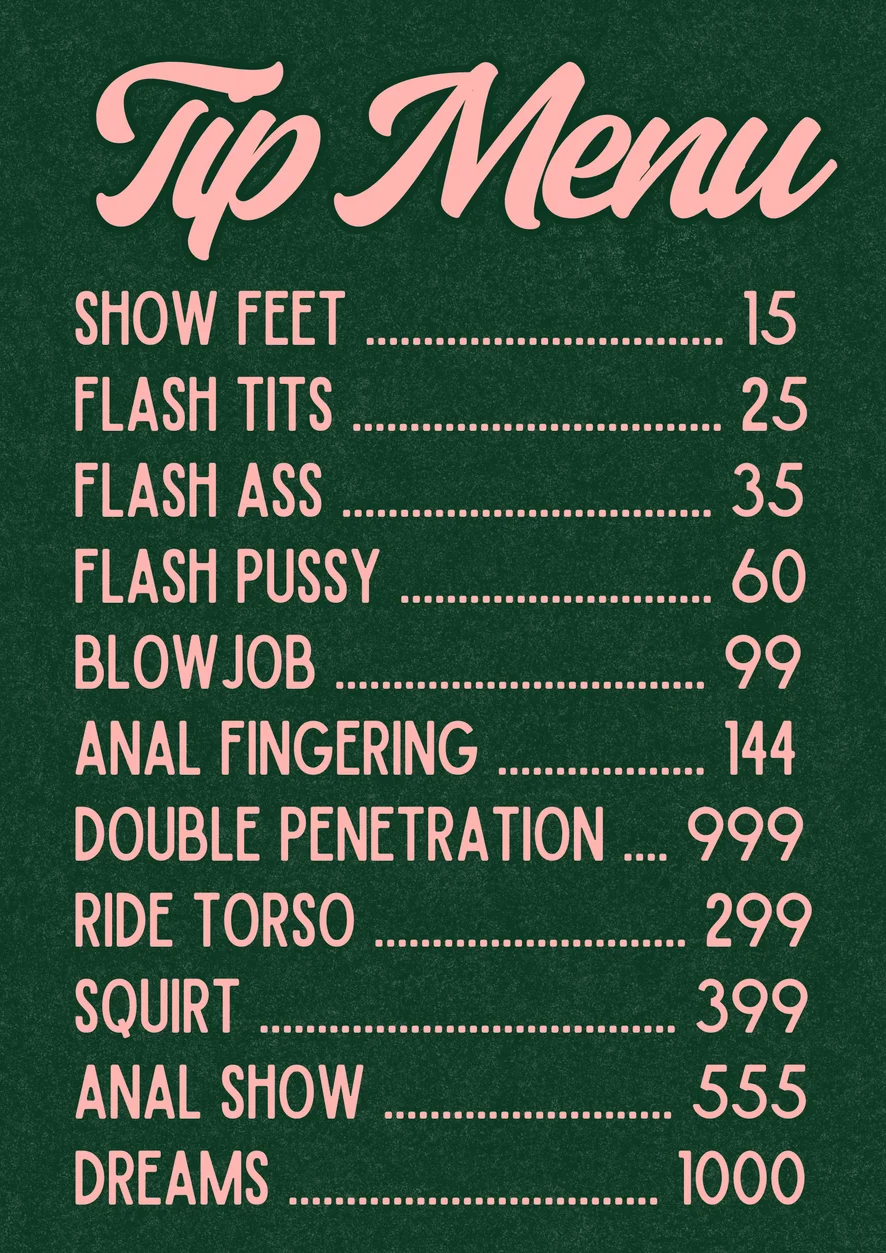 狗式, 高潮脸, 阴部骆驼趾, 大屌评分, 裙底风光, 电臀舞, 足交, 按摩, 鞭打, 色情舞, Cosplay, 指交, 脱衣舞, 抽烟, 性玩具, 丝袜, 高潮, 精油表演, 高跟鞋, 赤裸上身, 假阳具或震动器, 恋足, 手淫指导, 口交, 射精, 肛交到口交, 下流話, 深喉, 羞辱, 情境扮演, 后庭玩具, 乳头玩具, 自慰, 乳交, 粗暴, 骑乘女, 肛交, 潮吹